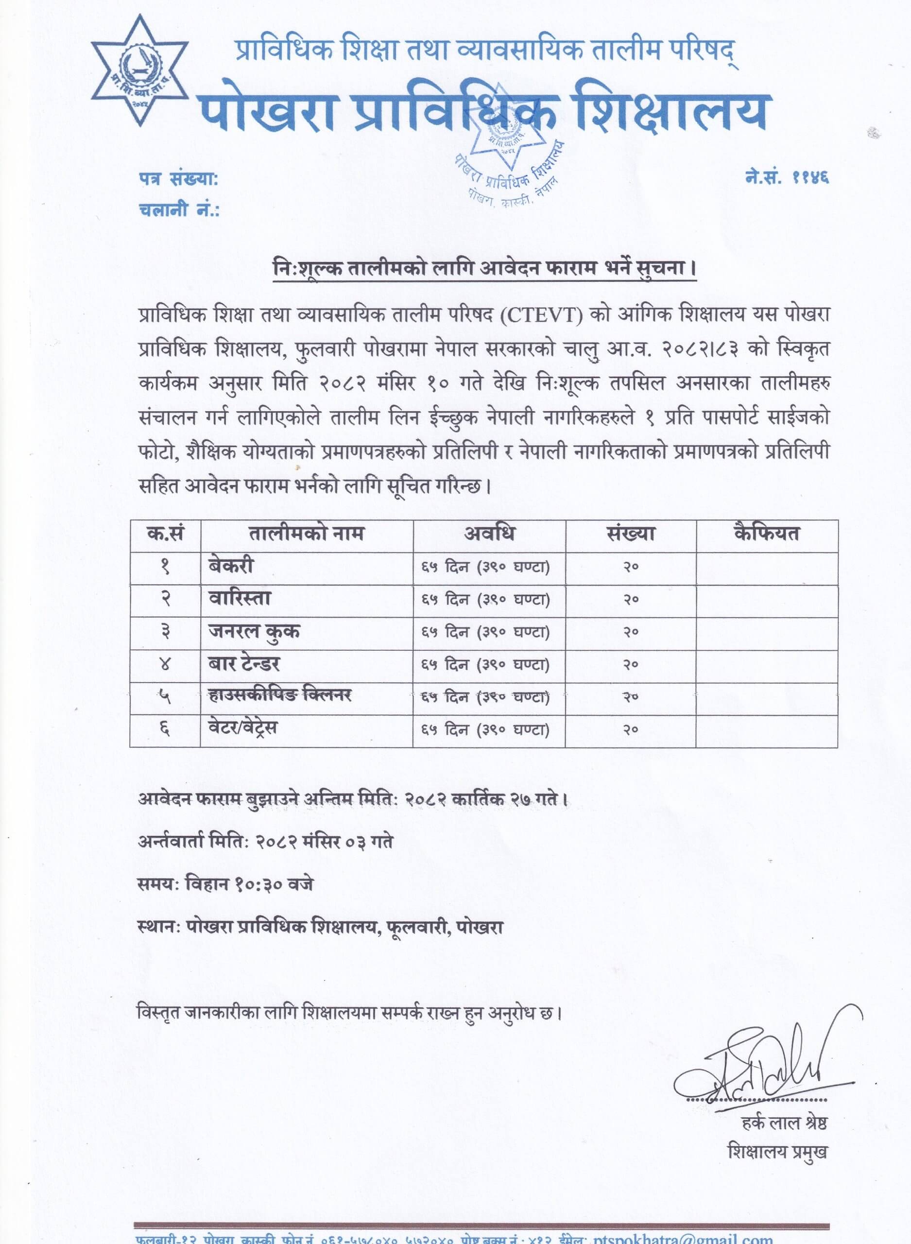 निःशूल्क तालीमको लागि आवेदन फाराम भर्ने सुचना ।